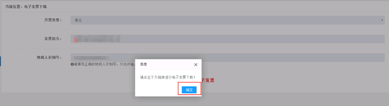 7、下载发票。点击“发票下载”,弹窗提示后,点击“点击下载电子发票”